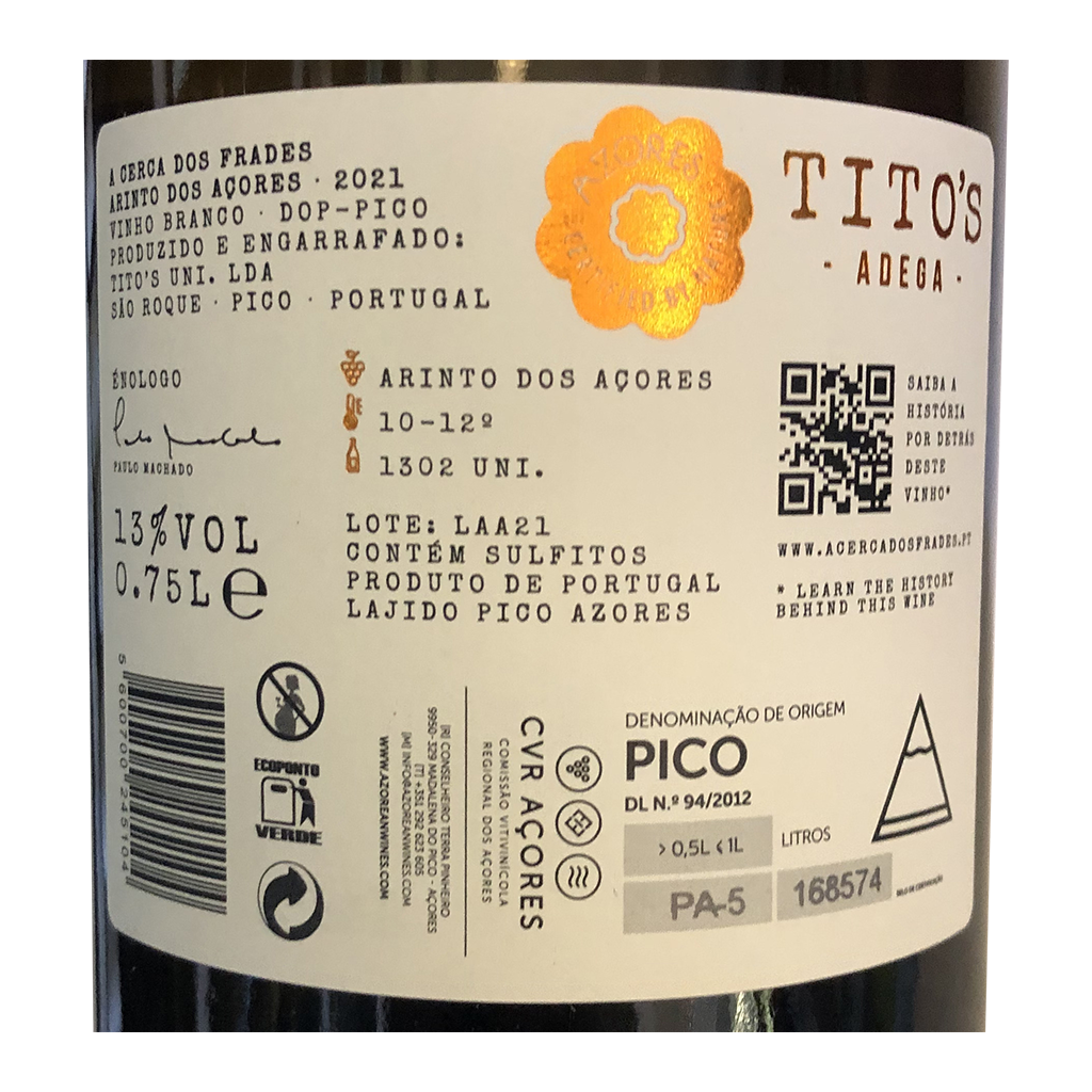 El A Cerca dos Frades - Vino Blanco, con 750ml es un Vino Blanco elaborado en Portugal - Açores por Tito's Adega.