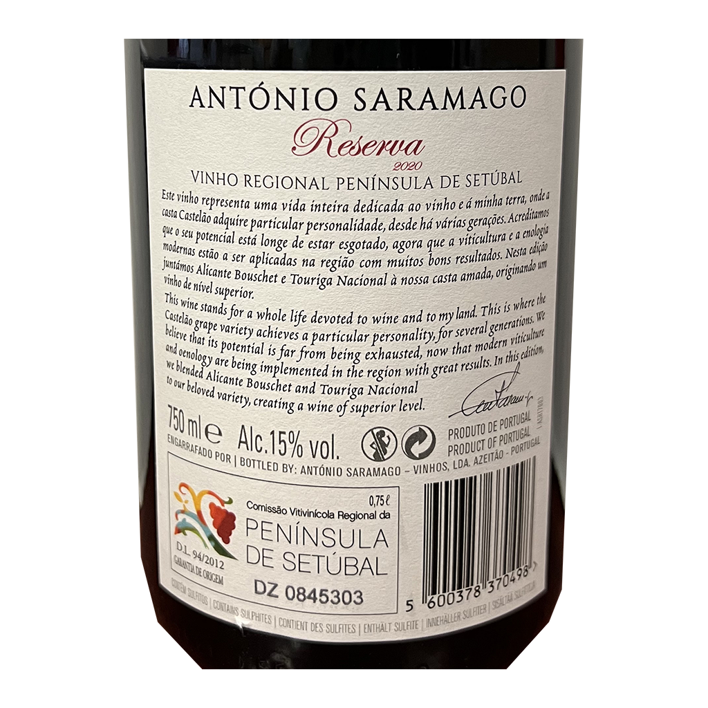 El A.S. - Vino Tinto, con 750ml es un Vino Tinto elaborado en Portugal - Península de Setúbal por António Saramago.