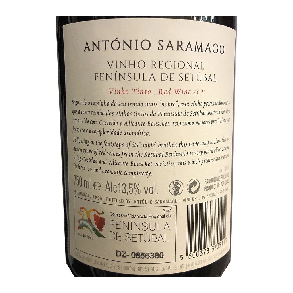 El A.S. - Vino Tinto, con 750ml es un Vino Tinto elaborado en Portugal - Península de Setúbal por António Saramago.
