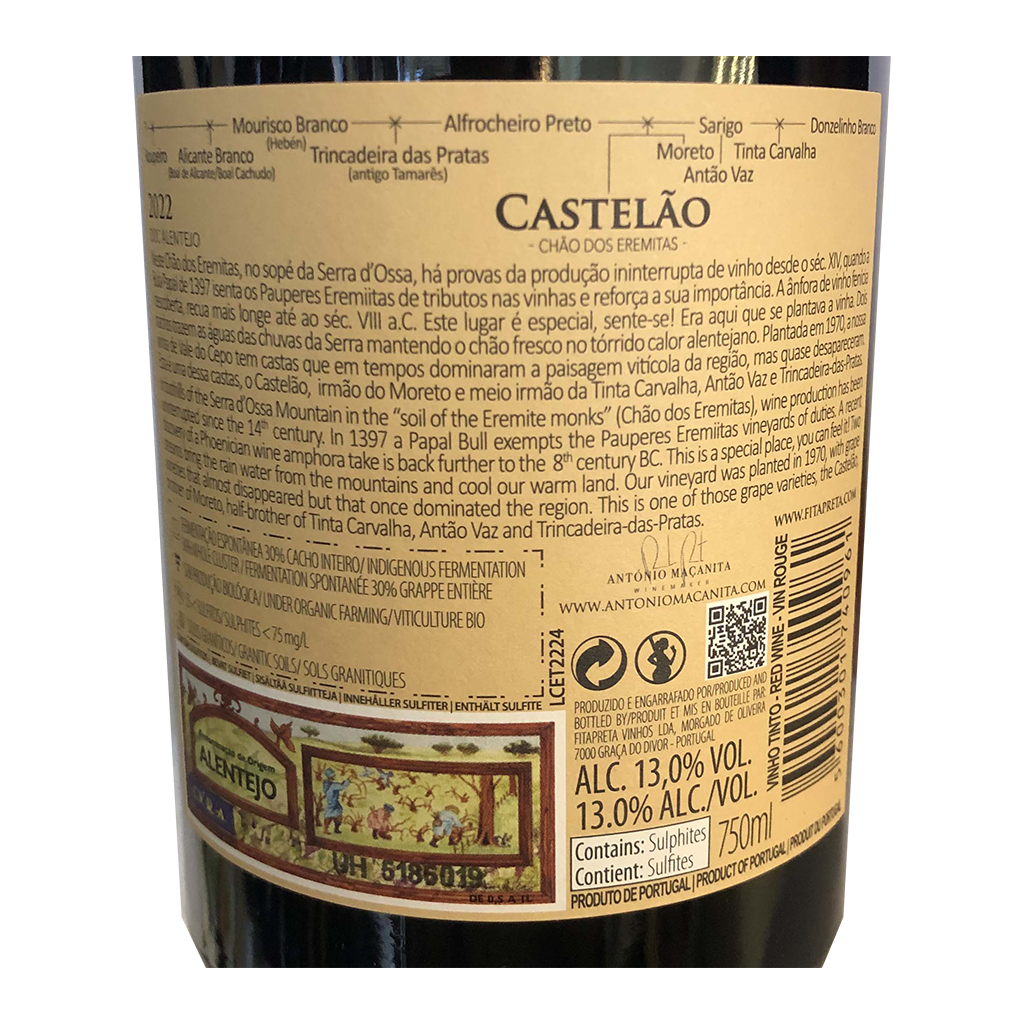 El Chão dos Eremitas Moreto - Vino Tinto, con 750ml es un Vino Tinto elaborado en Portugal - Alentejo por Fita Preta.