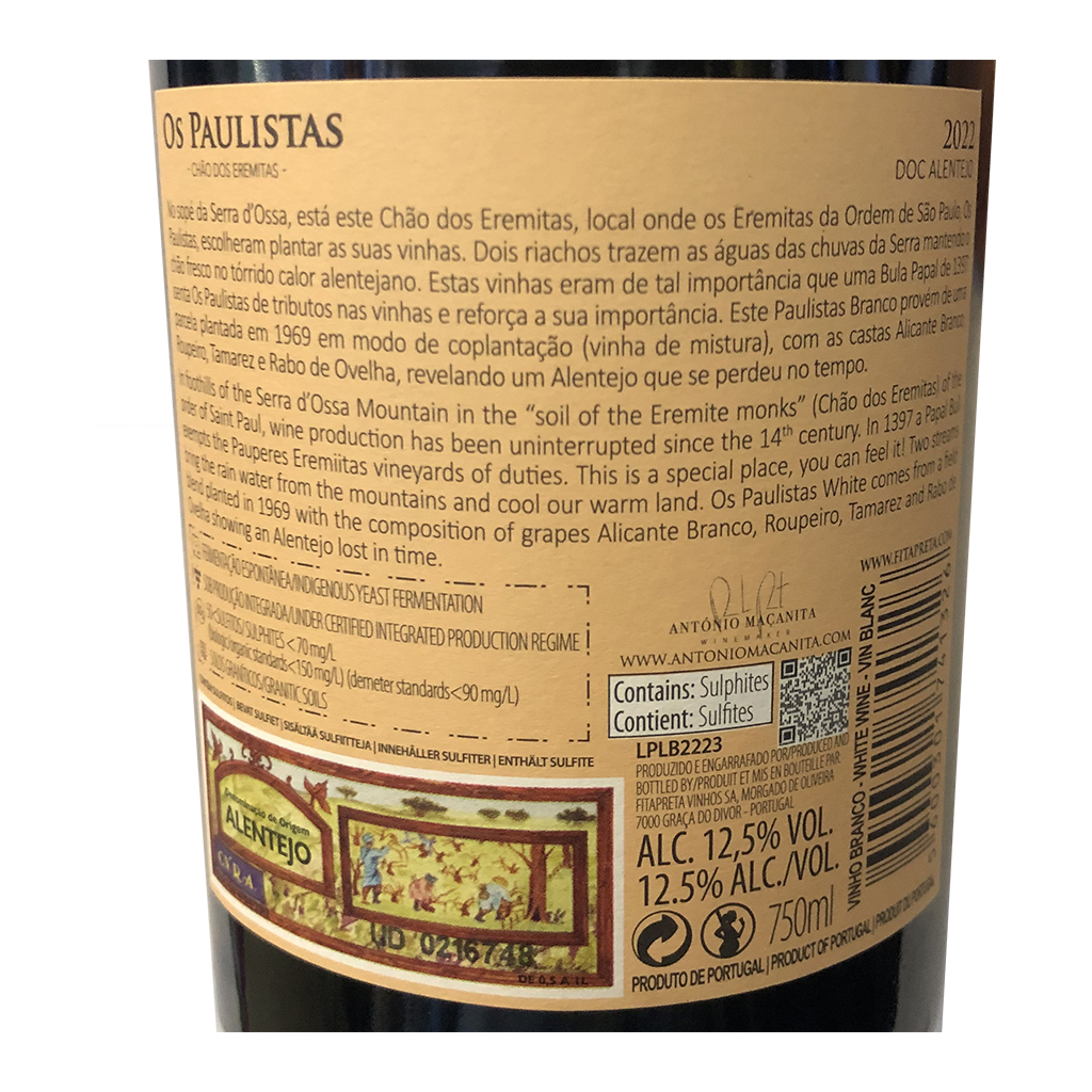El Chão dos Eremitas Os Paulistas - Vino Tinto, con 750ml es un Vino Tinto elaborado en Portugal - Alentejo por Fita Preta.