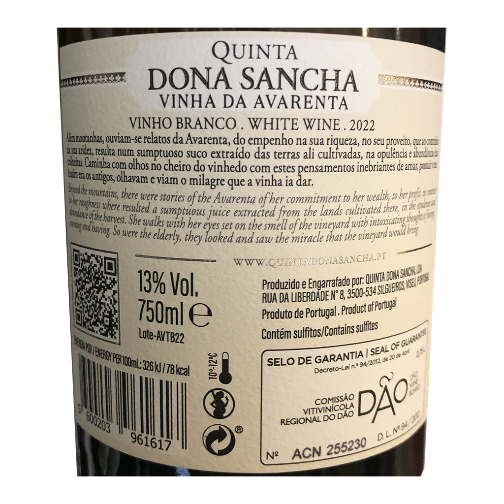El Dona Sancha Vinha da Avarenta Magnum - Vino Blanco, con 1500ml es un Vino Blanco elaborado en Portugal - Dão e Lafões por Quinta Dona Sancha.