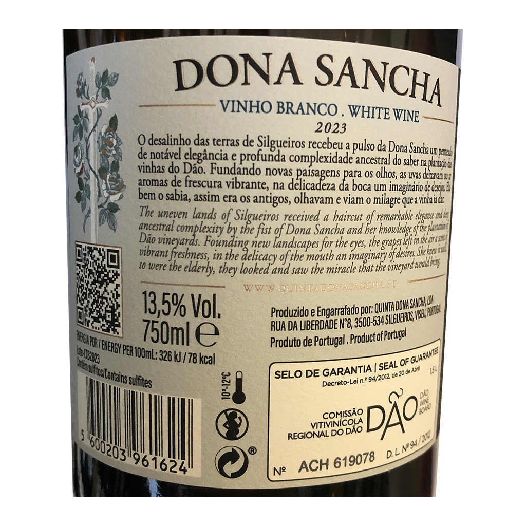 El Dona Sancha Encruzado - Vino Blanco, con 750ml es un Vino Blanco elaborado en Portugal - Dão e Lafões por Quinta Dona Sancha.