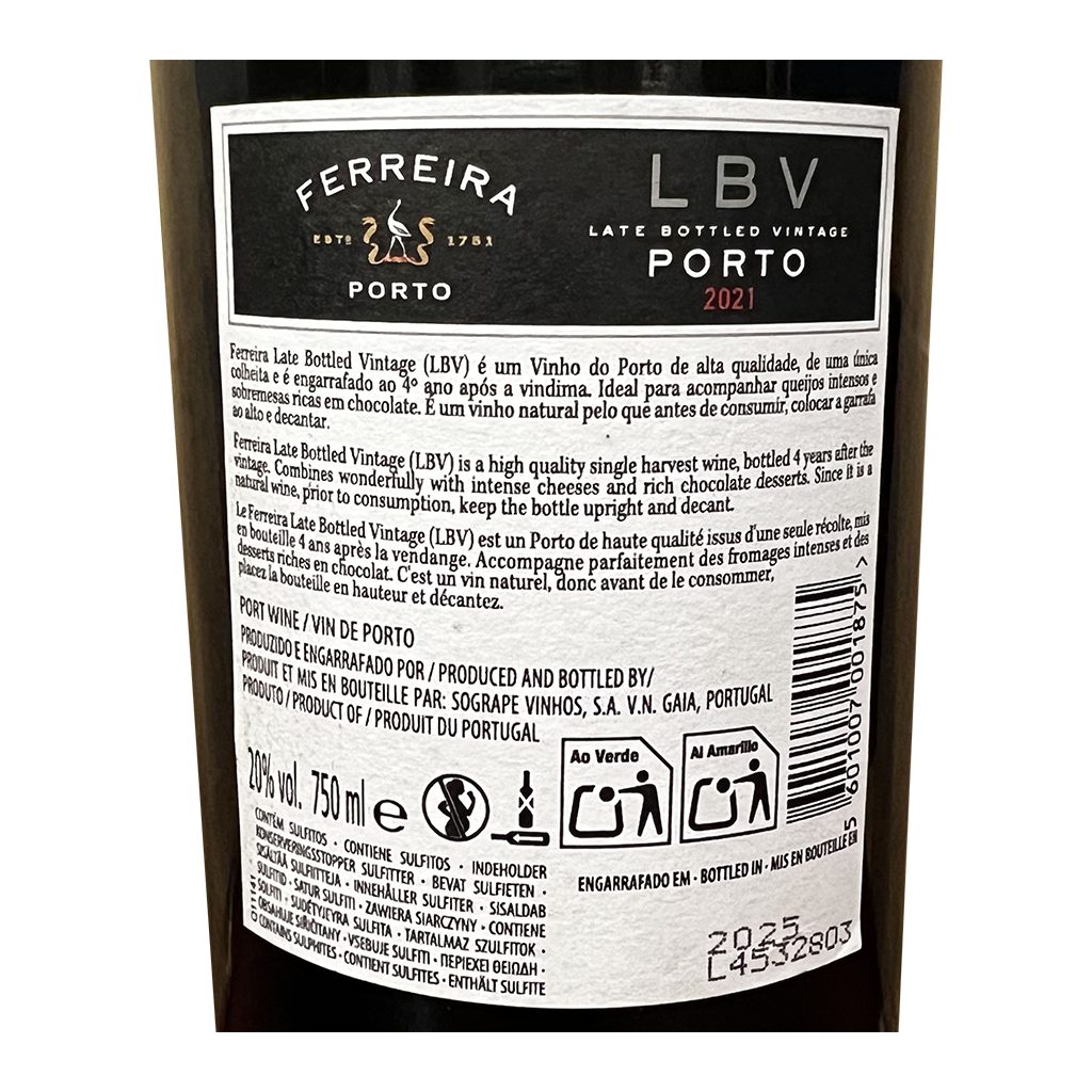 El Ferreira Vintage 2018 - Vino de Oporto, con 750ml es un Vino Fortificado elaborado en Portugal - Porto e Douro por Ferreira.