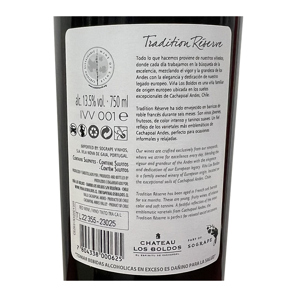 El Chateau Los Boldos Tradición Carmenere es un vino tinto de distinción, elaborado en la región de Cachapoal, un verdadero testimonio de la calidad y tradición vitivinícola.