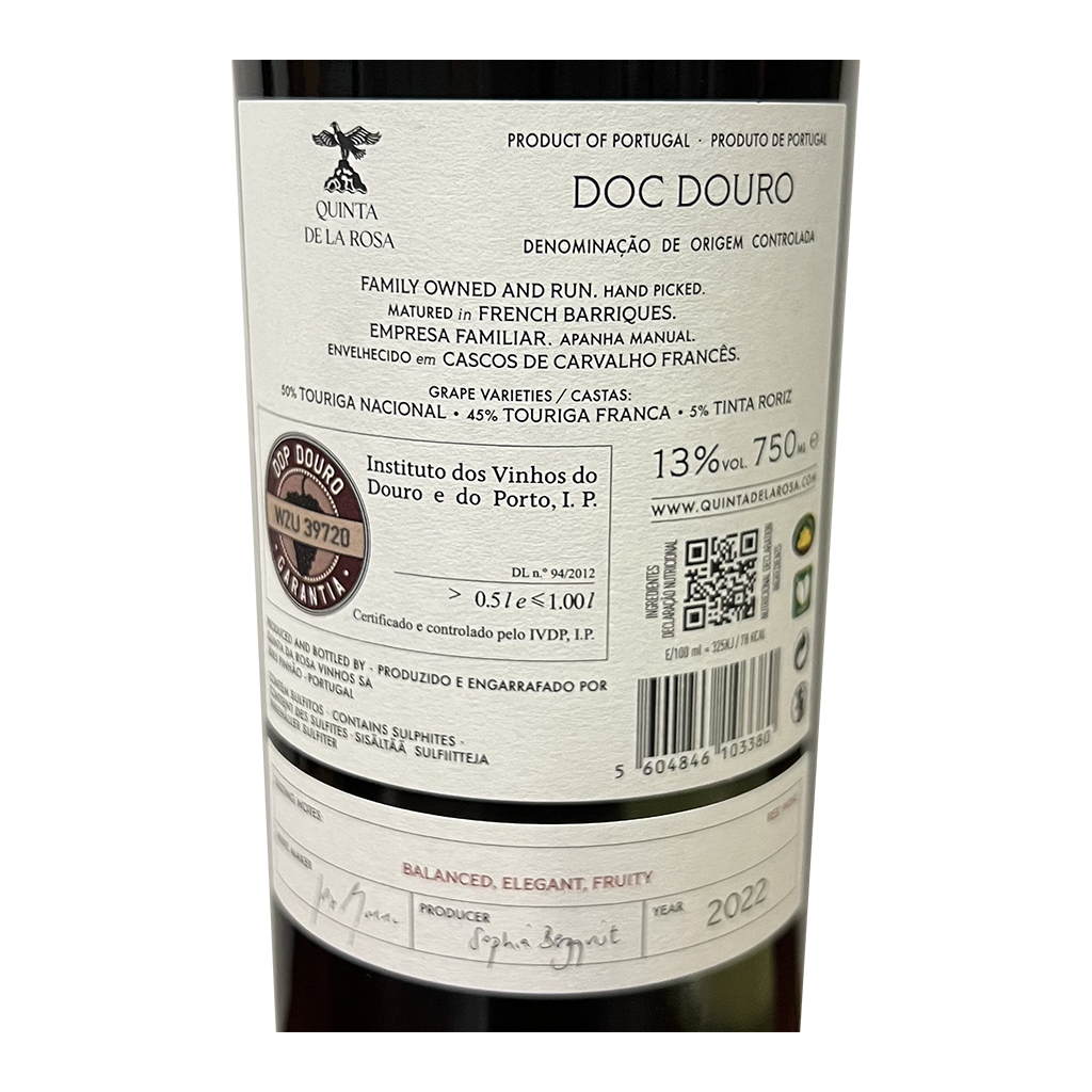 El tinto Quinta de La Rosa es una armoniosa mezcla de variedades de Oporto tradicionales, principalmente Touriga Nacional y Touriga Franca, con un pequeño porcentaje de Tinta Roriz, Sousão y viñedos viejos. Este vino tinto del Duero se esfuerza por permitir que las uvas se expresen en la botella manteniendo un equilibrio entre extracción, taninos y roble. El producto resultante es un vino rico y con cuerpo que aún mantiene frescura y vivacidad, cortesía de una buena acidez y mineralidad.
